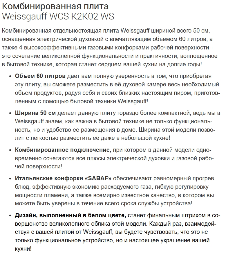 Комбинированная плита Weissgauff (Вайсгауф) WCS K2K02 WS