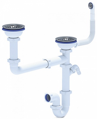 Комплектация Отводная арматура для двух разноуровневых чаш с выпусками 3 ? ” (D=90мм) и переливом
