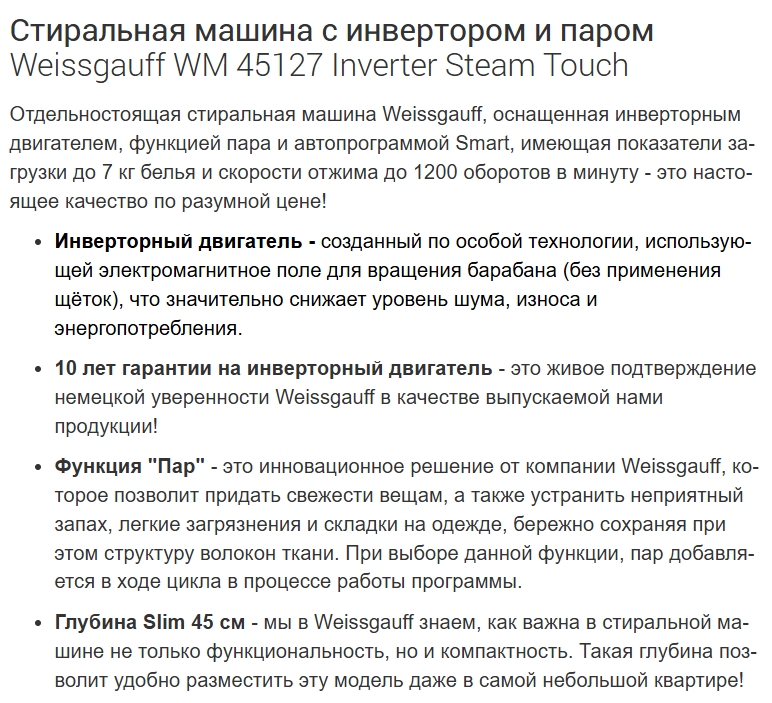 Встраиваемая стиральная машина Weissgauff (Вайсгауф) WM 45127 Inverter Steam Touch