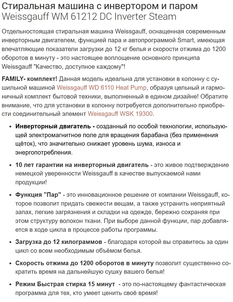 Встраиваемая стиральная машина Weissgauff (Вайсгауф) WM 61212 DC Inverter Steam