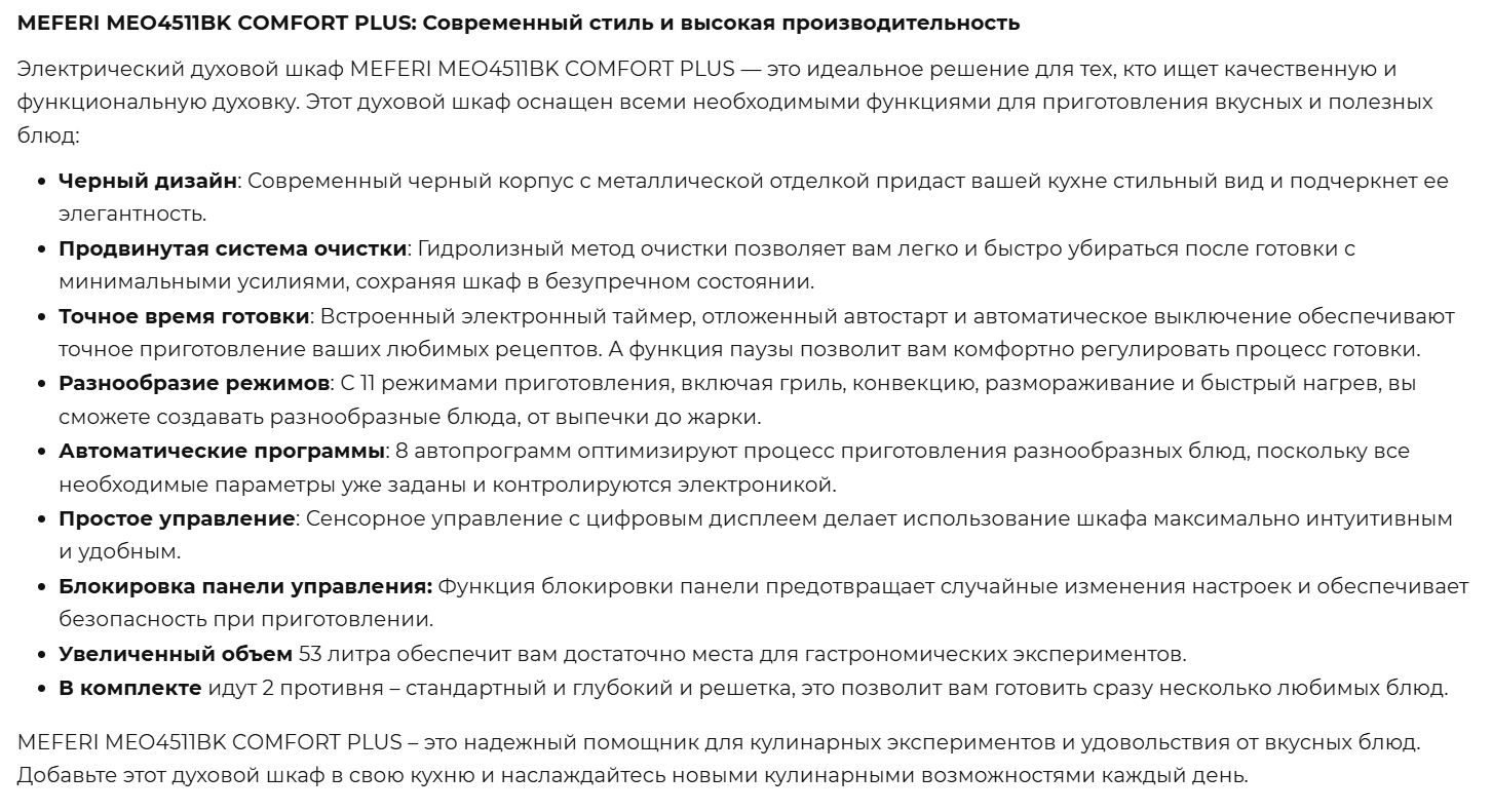 Электрический духовой шкаф Meferi (Мефери) MEO4511BK COMFORT PLUS