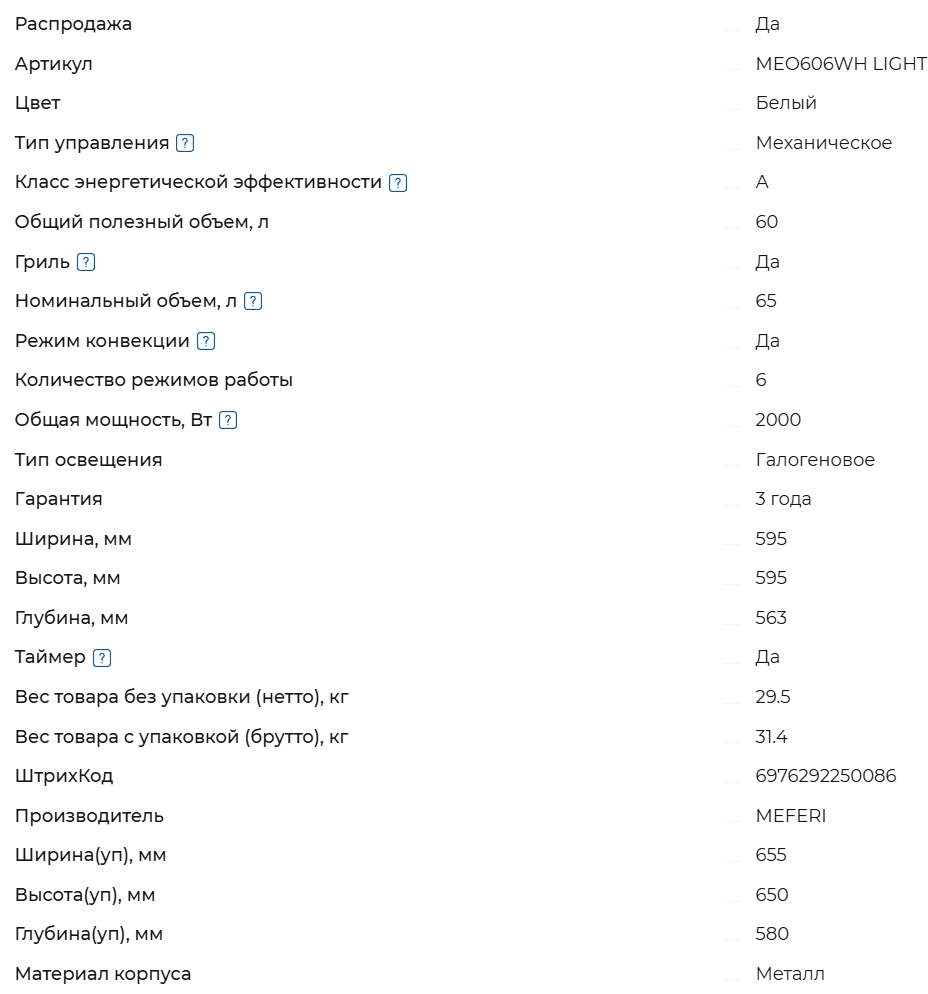 Электрический духовой шкаф Meferi (Мефери) MEO606WH LIGHT