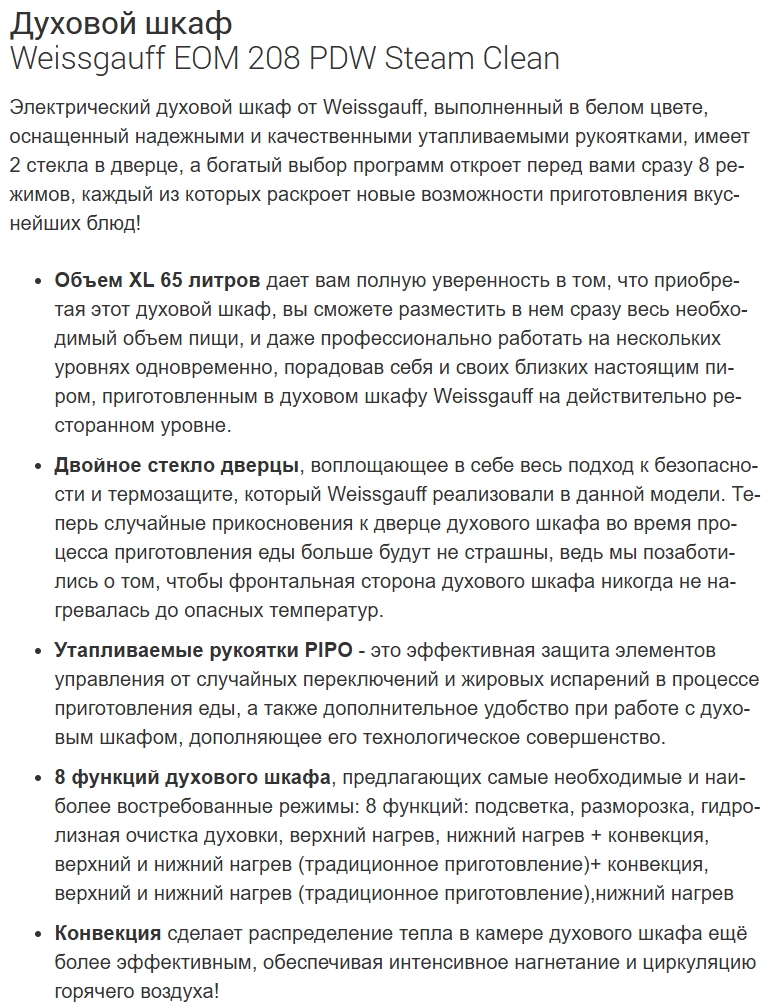 Электрический духовой шкаф Weissgauff (Вайсгауф) EOM 208 PDW Steam Clean