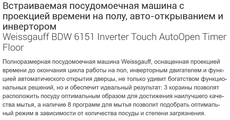Встраиваемая посудомоечная машина Weissgauff (Вайсгауф) BDW 6151 Inverter Touch AutoOpen Timer Floor