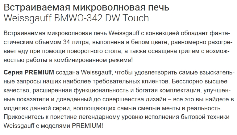 Встраиваемая микроволновая печь Weissgauff (Вайсгауф) BMWO-342 DW Touch