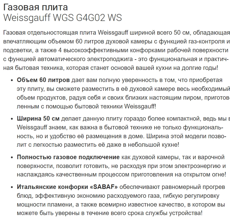 Газовая плита Weissgauff (Вайсгауф) WGS G4G02 WS