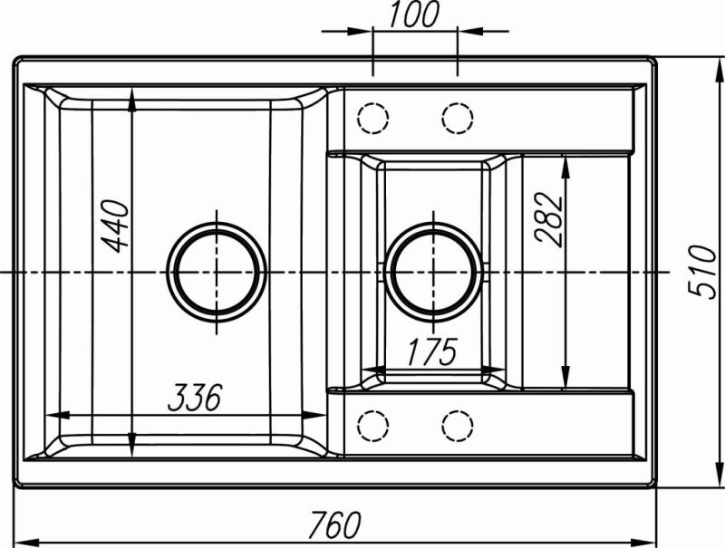 Прямоугольная кухонная мойка с двумя чашами, оборачиваемая (основную чашу можно разместить как справа, так и слева, отверстие под смеситель изготавливается при установке кухонной мойки).
