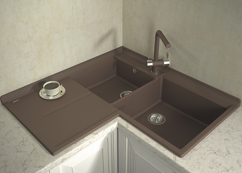 Угловой блок с двумя вместительными чашами и просторным крылом;Эта мойка позволит максимально удобно использовать угловое пространство кухни.