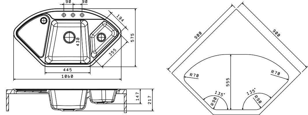 Профессиональная угловая мойка с дополнительной малой чашей и углубленным крылом;