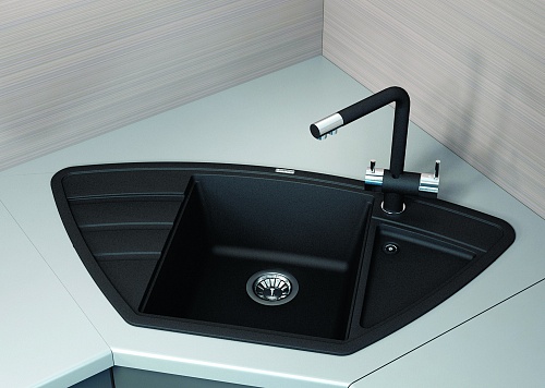Угловая мойка с четкими контурами;Гармоничный дизайн;Дополнительные отверстия под аксессуары.