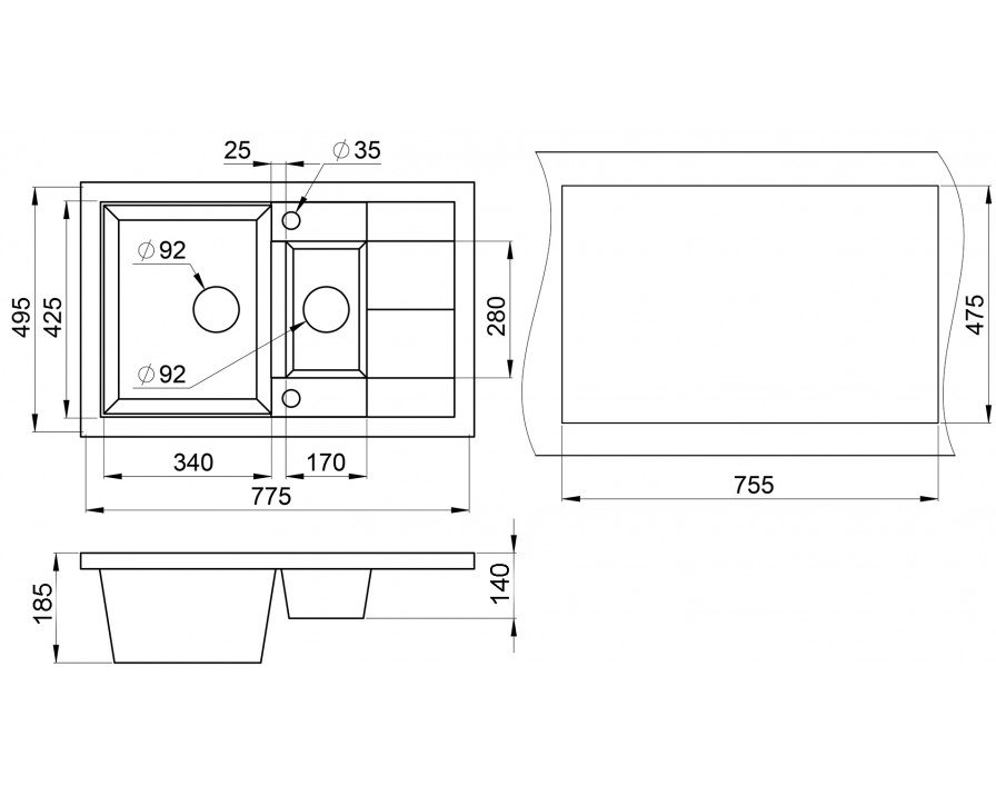 | Размер чаши мойки, мм | 340x425, 170x280 |