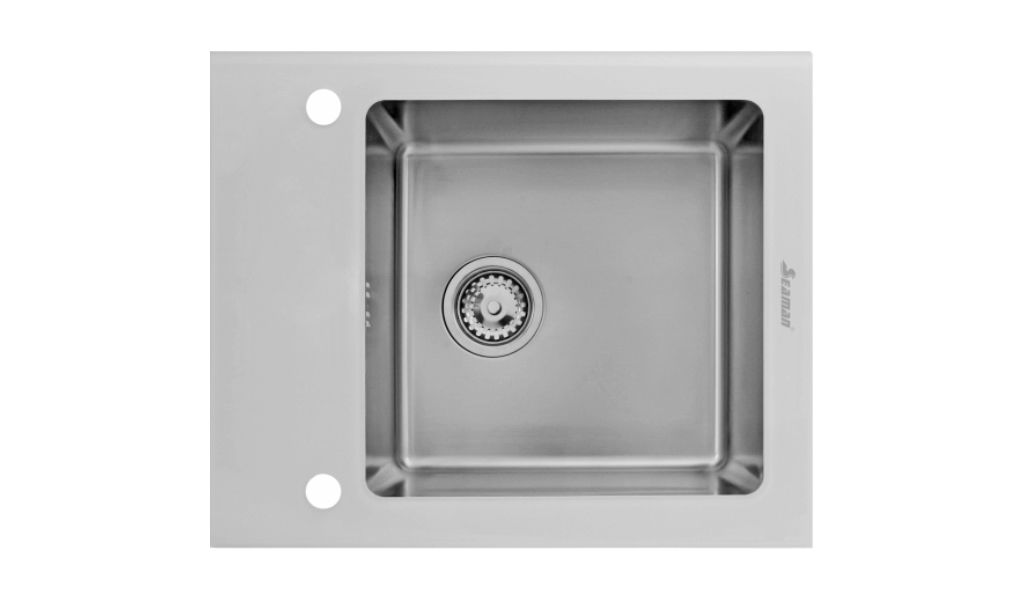 Кухонная мойка Seaman Eco Glass SMG?610W с вентиль-автоматом – компактная врезная прямоугольная оборачиваемая мойка для кухни из нержавеющей стали с полкой под смеситель и аксессуары и панелью из надежного закаленного стекла белого цвета.