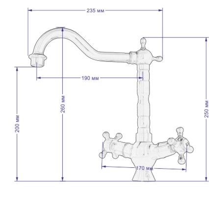 Высота смесителя: 250мм. Длина смесителя: 235мм.