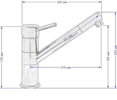 Высота смесителя: 215мм. Длина смесителя: 240мм.