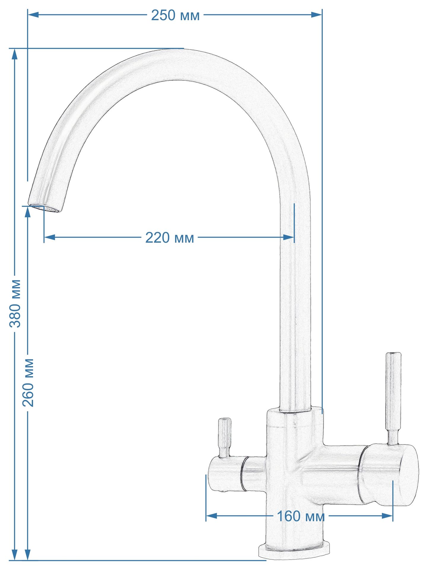 Высота смесителя: 380мм. Длина смесителя: 250мм.