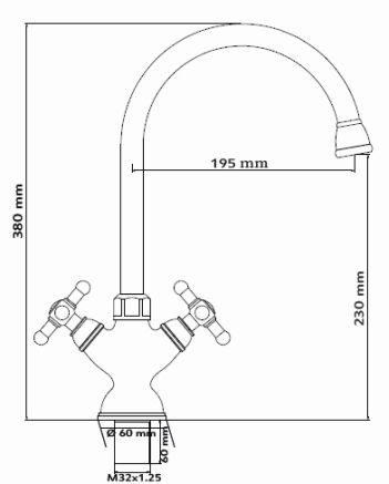 Высота смесителя: 380 мм. Высота излива: 230 мм. Длина излива: 195 мм.