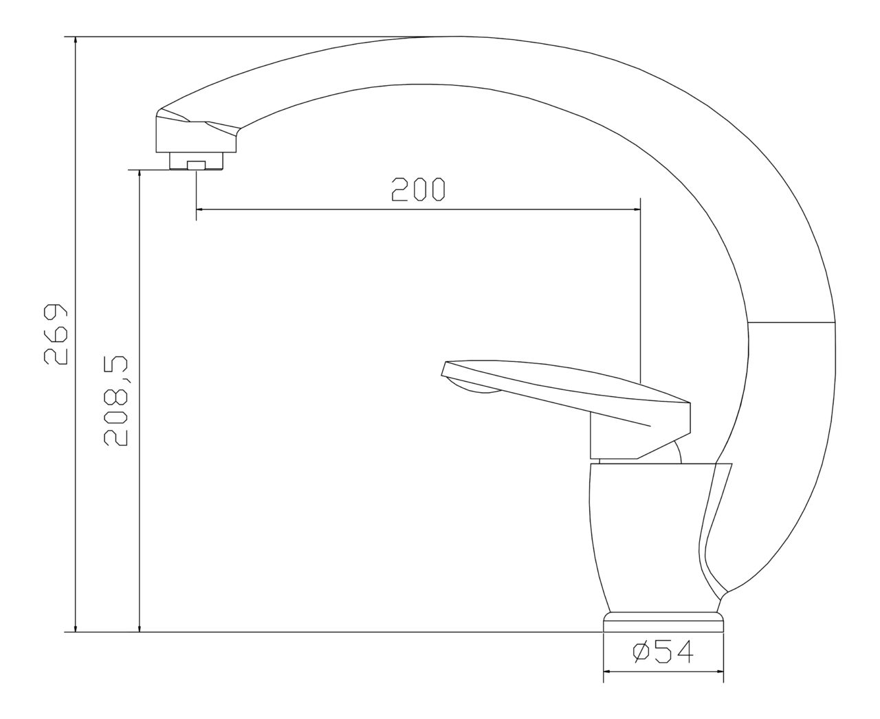 Высота смесителя: 269 мм. Высота излива: 208 мм. Длина излива: 200 мм.