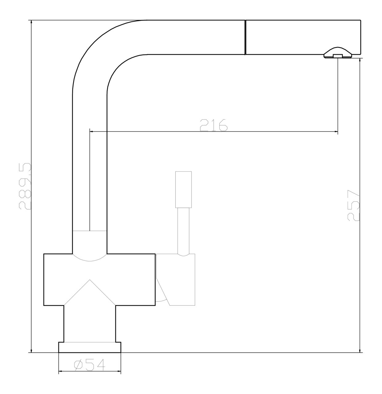Высота смесителя: 289 мм. Высота излива: 257 мм. Длина излива: 216 мм.