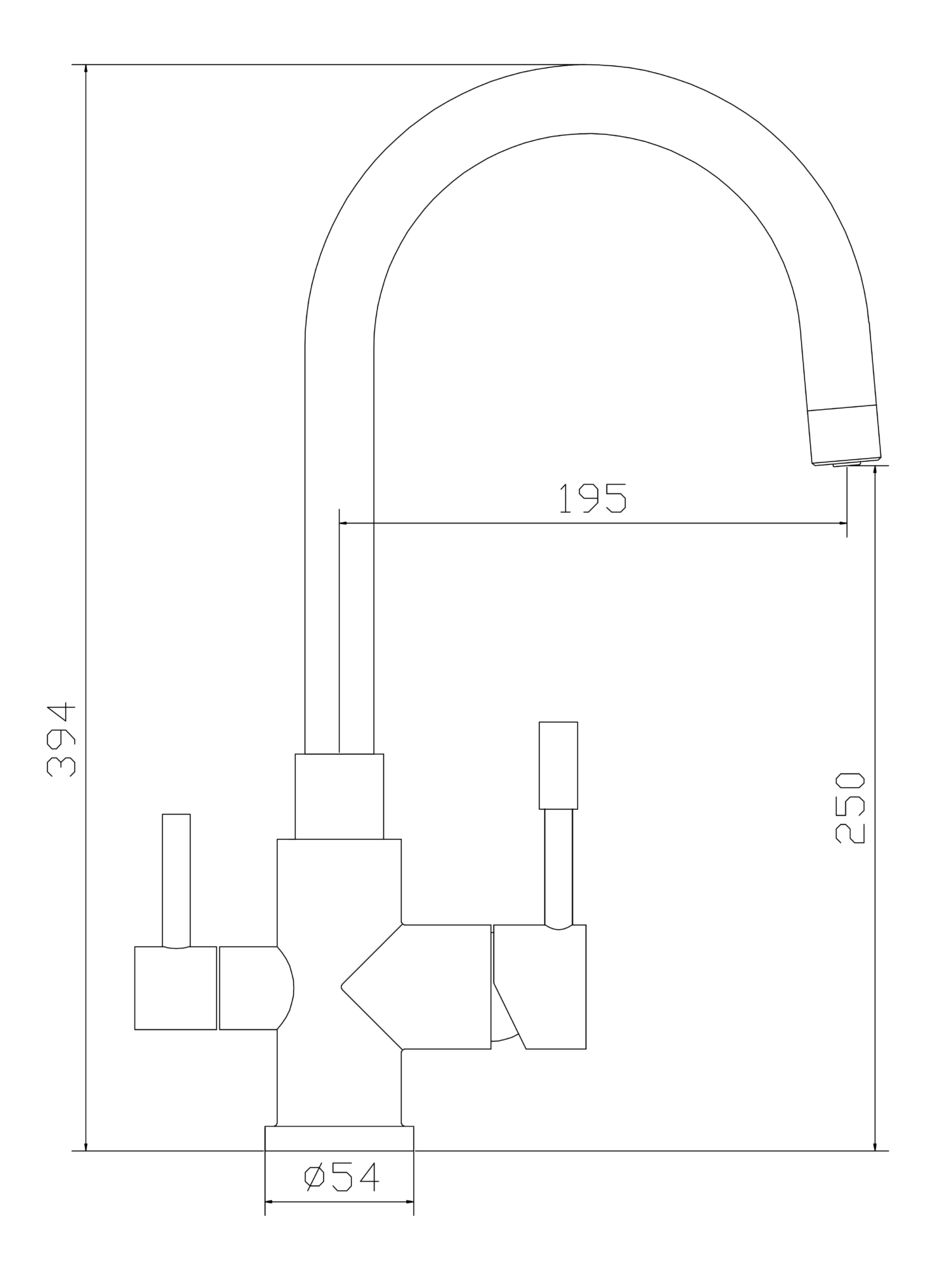 Высота смесителя: 394 мм. Высота излива: 250 мм. Длина излива: 195 мм.
