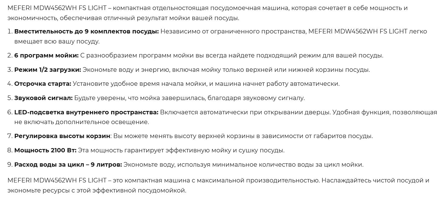 Посудомоечная машина Meferi (Мефери) MDW4562WH FS LIGHT