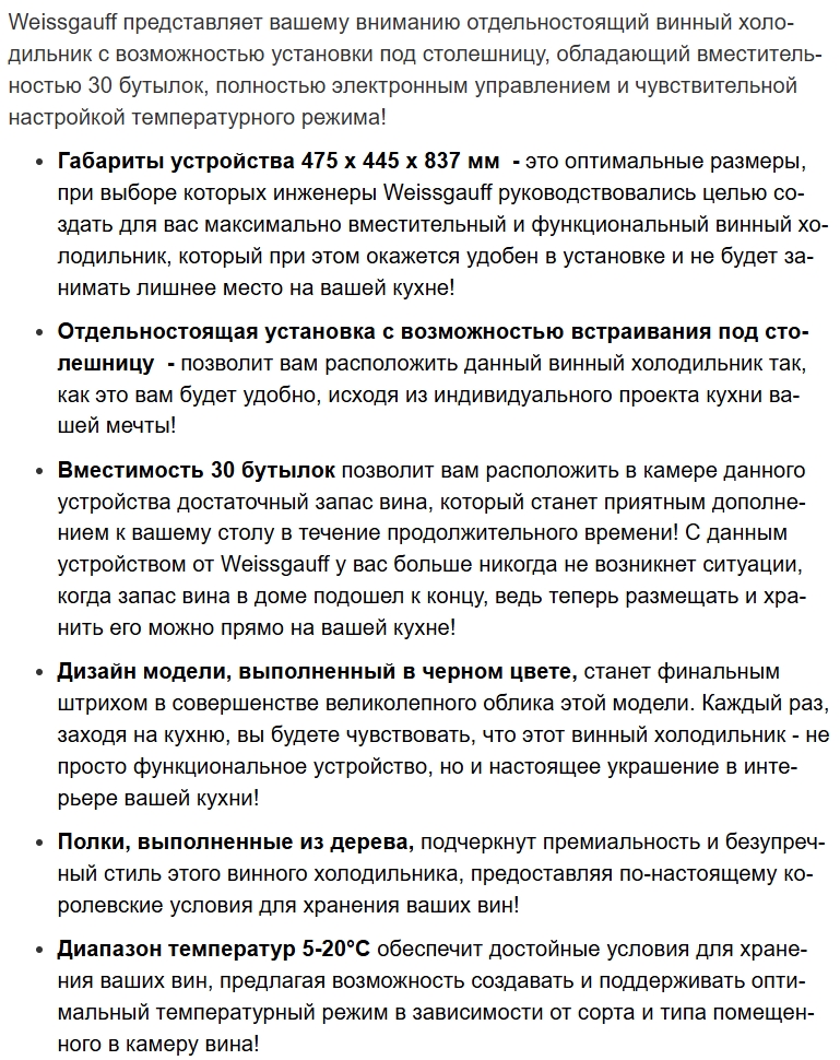 Винный шкаф Weissgauff (Вайсгауф) WWC-30 Bottle