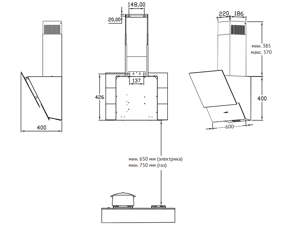 закрывает плоскость варочной поверхности. Настенный монтаж Данные вытяжки монтируются к стене, поэтому