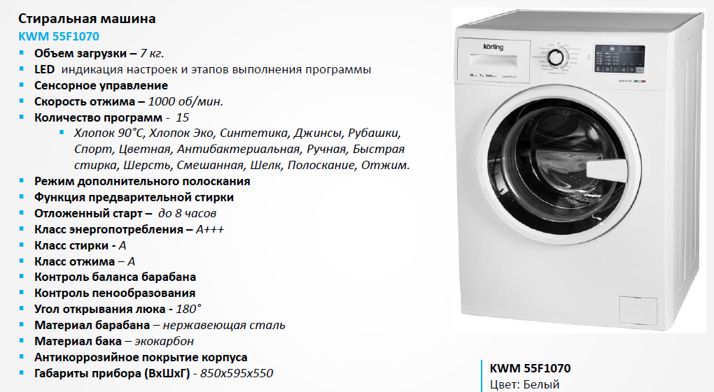 Стиральная машина с фронтальной загрузкой, загрузка 7 кг, скорость отжима 1000 об/мин, сенсорное управление, LED индикация настроек и этапов выполнения программы, 15 программ стирки, отложенный старт до 8-и часов, Контроль баланса, Контроль пенообразования, Функция предварительной стирки, Функция дополнительного полоскания, Антибактериальная программа, Класс энергопотребления А+++, Класс стирки А, Класс отжима А, Габариты (ВхШхГ) - 850х595х550, цвет - белый | |