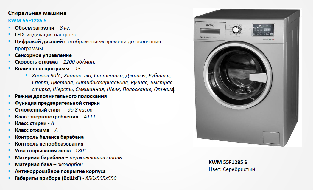 Стиральная машина с фронтальной загрузкой, загрузка 8 кг, скорость отжима 1200 об/мин, сенсорное управление, LED индикация настроек и этапов выполнения программы, Цифровой Дисплей с индикацией продолжительности программы, 15 программ стирки, отложенный старт до 8-и часов, Контроль баланса, Контроль пенообразования, Функция предварительной стирки, Функция дополнительного полоскания, Антибактериальная программа, Класс энергопотребления А+++, Класс стирки А, Класс отжима А, 850х595х550, цвет - серебристый | |