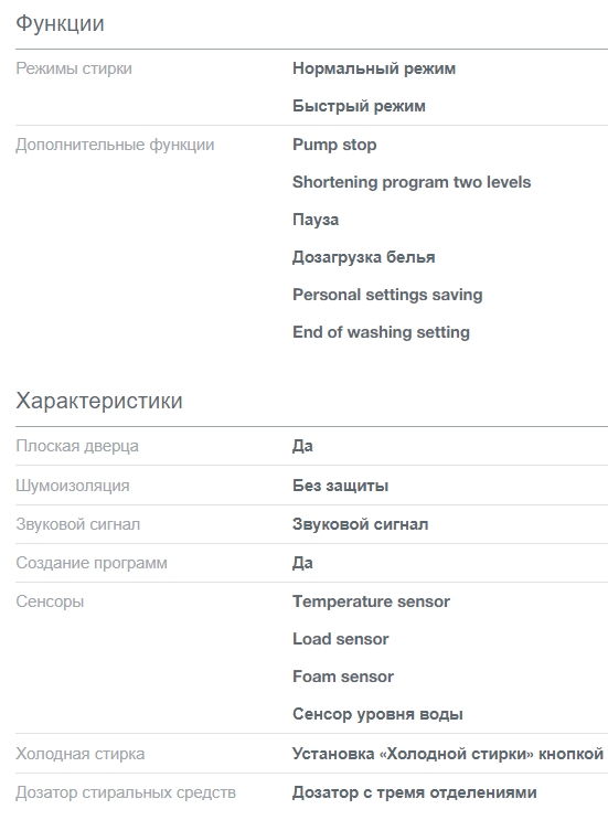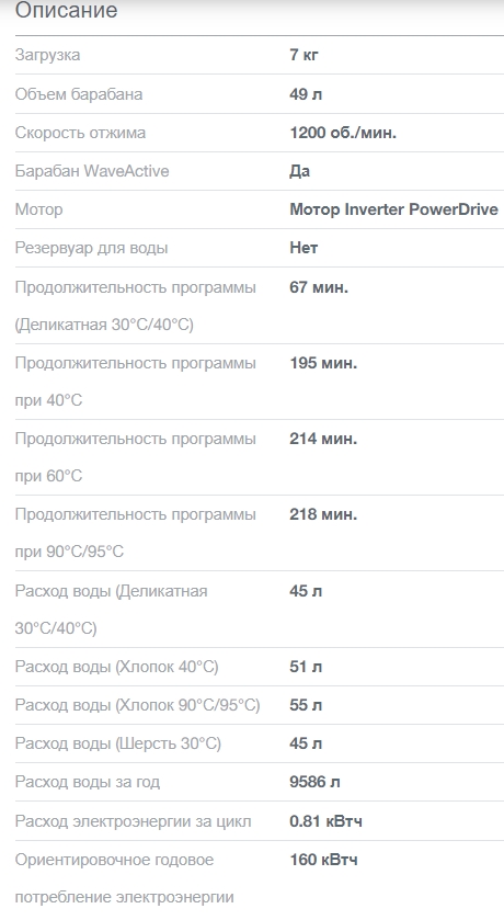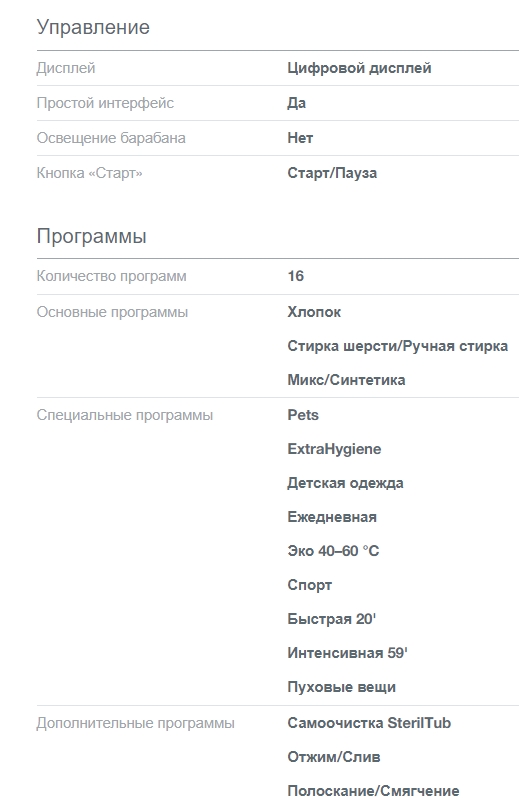 Ежедневная, Экстра гигиена, Детское, Питомцы, Спорт, Пуховые вещи, Полоскание, Отжим/Слив, Самоочистка, Хлопок белое, Цветное, Микс, Шерсть, Eco 40-60C, Супер 59/32 минуты, Быстрая 20 минут |