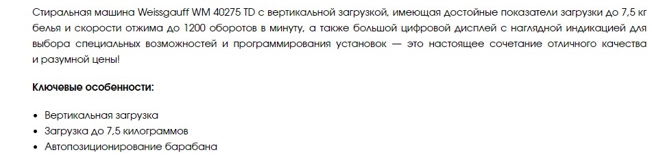 Стиральная машина Weissgauff (Вайсгауф) WM 40275 TD