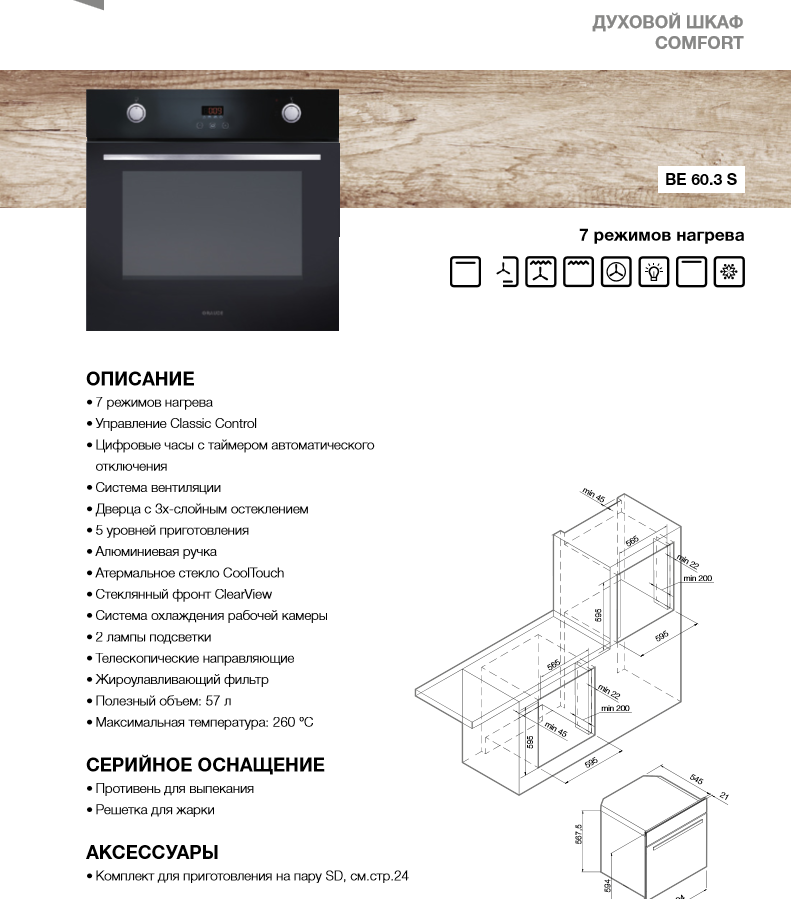 ОПИСАНИЕ - 7 режимов нагрева - Управление Classic Control - Цифровые часы с таймером автоматического отключения - Система вентиляции - Дверца с 3х-слойным остеклением - 5 уровней приготовления - Алюминиевая ручка - Атермальное стекло CoolTouch - Стеклянный фронт ClearView - Система охлаждения рабочей камеры - 2 лампы подсветки - Телескопические направляющие - Жироулавливающий фильтр - Полезный объем: 57 л - Максимальная температура: 260 °C СЕРИЙНОЕ ОСНАЩЕНИЕ: Противень для выпекания Решетка для жарки АКСЕССУАРЫ: Комплект для приготовления на пару SD СТРАНА ПРОИЗВОДСТВА: - Германия |
