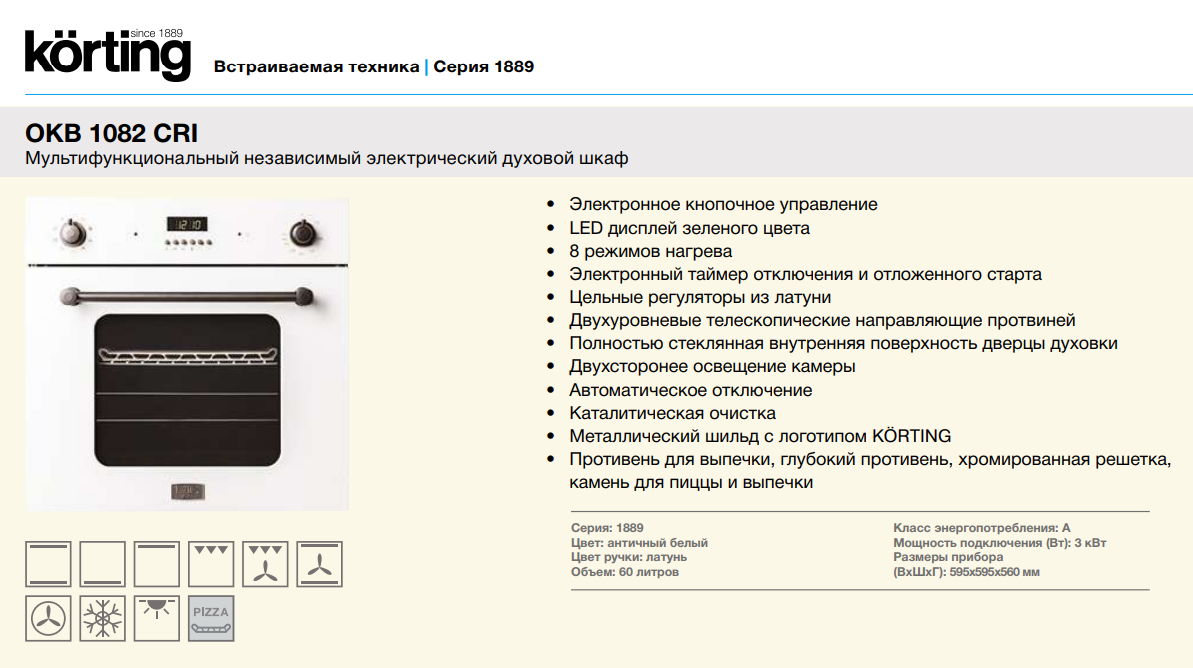 духовки Korting OKB 1082 CRI составляет 60 литров. Высота – 59,5см,