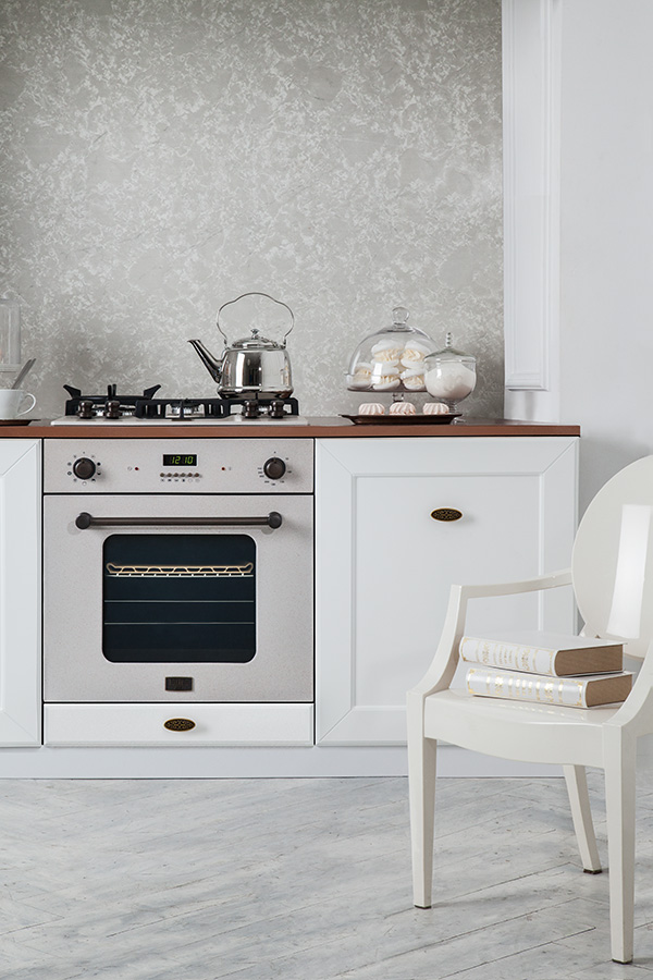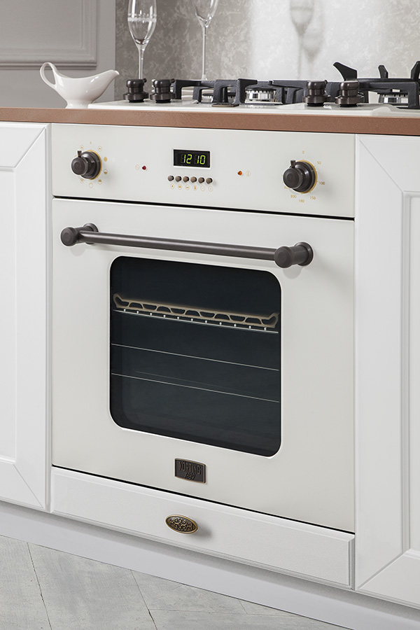мебель, оснащен поворотными переключателями. Дизайн электрической духовки выполнен в стиле ретро, нежного кремового