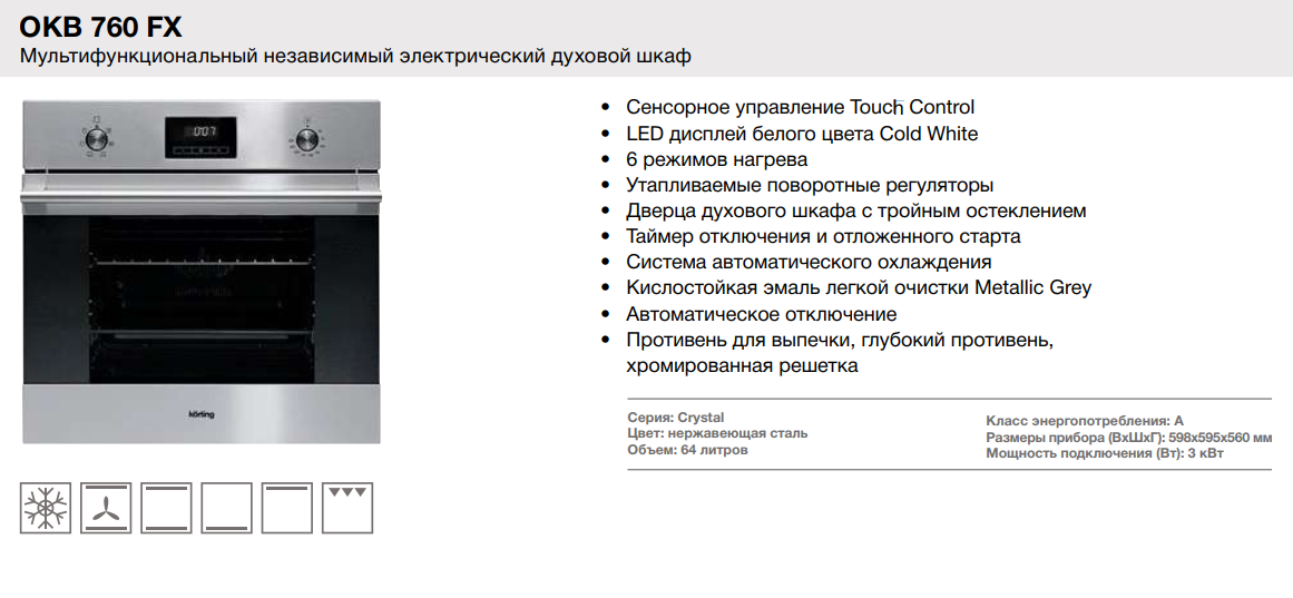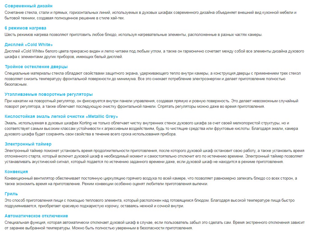 Духовые шкафы объемом 64 литра выпускаются в черном, белом и серебристом цвете и имеют такие преимущества: - сенсорное управление позволяет просто руководить приготовлением – подскажет на какой уровень поместить противень, чтобы блюдо идеально приготовилось; - электрический духовой шкаф Korting OKB 760 FN обеспечивает шесть различных режимов нагрева, что позволяет выбрать наилучшую температуру для готовки, а таймер автоматически отключит духовку по завершении процесса; - поворотные утопленные регуляторы не нагреваются и позволяют регулировать процесс приготовления поворотом и нажатием; - с помощью таймера включается функция отложенного старта, когда помещенное в духовку блюдо начинает готовиться в обозначенное время; - внутреннее покрытие духовки состоит из особой эмали легкой очистки Metallic Gray, - после приготовления пищи нужно всего лишь протереть внутренность шкафа влажной тряпочкой; - тройное термостойкое остекление духовки обеспечивает установление внутри определенной температуры и делает невозможным нагревание внешнего стекла; - освещение позволяет визуально контролировать процесс приготовления. Электрический духовой шкаф Korting OKB 760 FN и его комплектация В комплект входят: противень для выпечки, глубокий противень и хромированная решетка. На стенках духовки крепятся удобные держатели, что прочно фиксируют противень на разных уровнях. Купить Korting OKB 760 можно, заказав его на сайте и получив в стационарном магазине или через курьерскую службу доставки компании. | |