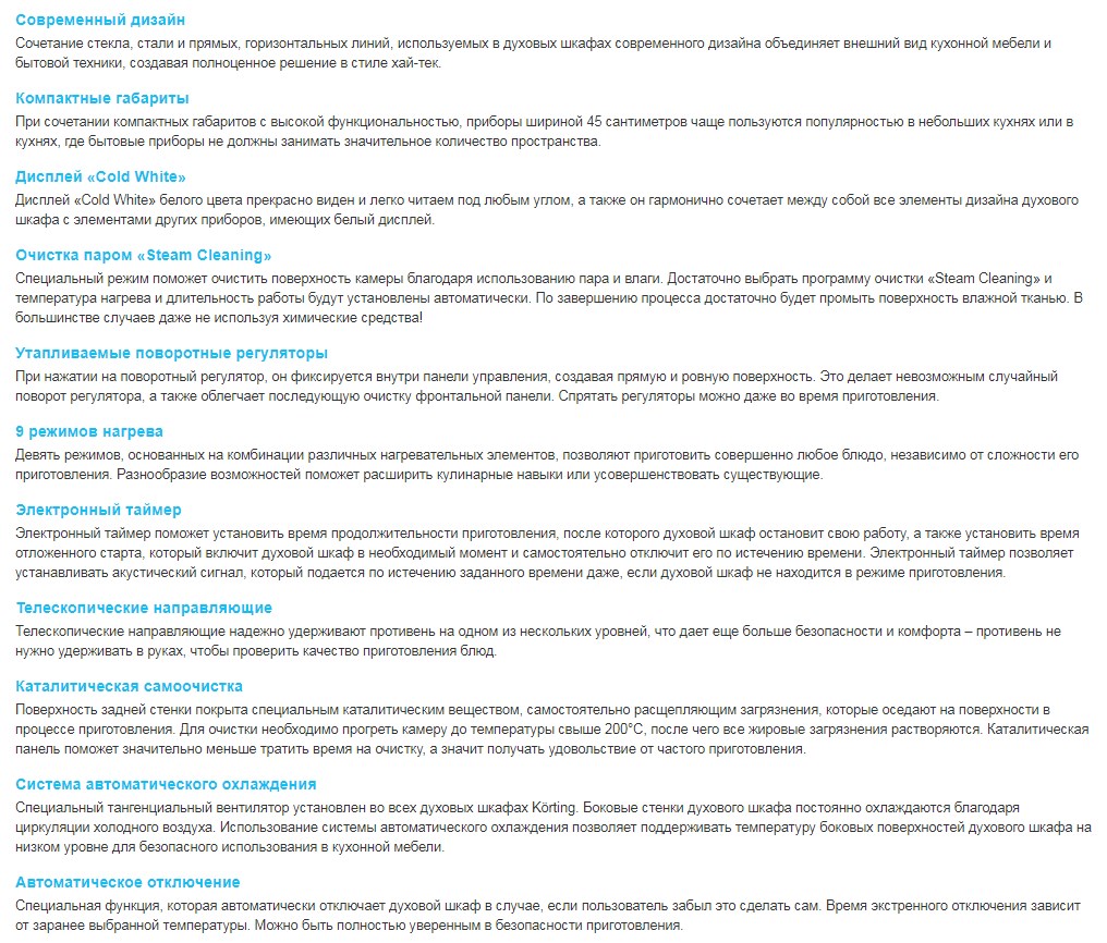 Электрический духовой шкаф Korting OKB 7951 CMB объединяет в себе строгий классический стиль и современное практичное решение. Благодаря наличию различных встроенных функций он сможет превратить скучный процесс приготовления пищи в интересное и интригующее занятие. Данная модель отличается своими небольшими габаритами, позволяющими разместить ее даже на небольшой кухне. Строгие и лаконичные линии всецело дополнят любой интерьер кухни в современном стиле хай-тек. Даже самые сложные блюда будут готовиться легко за счет девяти режимов работы духового шкафа. Общая температура нагрева составляет 240 градусов, а сами нагревательные элементы практично размещены по всей поверхности духовой камеры. Чистить ее так же легко, как и готовить. Благодаря специальному каталитическому покрытию и функции очистки паром любые пищевые загрязнения быстро и эффективно растворяются. Управление осуществляется с помощью удобного сенсорного дисплея «Cold White» и поворотных регуляторов, которые при нажатии фиксируются в панели духового шкафа. Также Korting OKB 7951 CMB отличается своей безопасностью. Для этого предусмотрено наличие системы охлаждения корпуса духовой камеры и двойные стекла в дверцах. Использование практичного таймера позволит любой хозяйке отследить время приготовления пищи или отключить духовку по истечению заданного времени. Чтобы проверить готовность блюда, предусмотрены телескопические направляющие для противней. Это позволяет самостоятельно и безопасно удерживать противень на одном из уровней. Подарите себе возможность легкого и качественного приготовления любых блюд для вашей семьи. Все, что для этого нужно – купить Korting OKB 7951 CMB в нашем интернет-магазине. | |