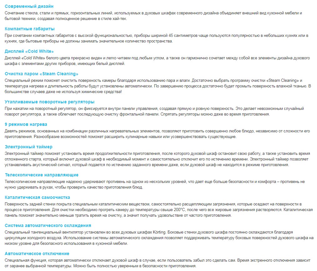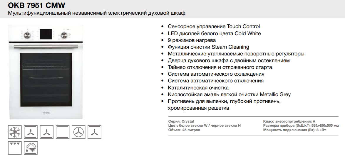 Все любят вечера, когда удается собраться семьей за ужином, особенно если вечер праздничный. За чашечкой чая и черничным пирогом, который согреет теплом и придаст семейной встрече особенной таинственности и тепла сердцам. В приготовлении вкусных яств и любимых блюд вам поможет электрический духовой шкаф Korting OKB 7951 CMW. Он довольно прост в использовании и легок в управлении. Шкаф органично впишется в интерьер вашей кухни, какими бы смелыми не были ваши решения в оформлении. Купить Korting OKB 7951 CMW именно у нас выгодно, так как постоянно проходят различные акции и распродажи, помимо этого вы безоговорочно можете быть уверены в качестве приобретенной продукции. Духовка шириной 45 см идеально впишется даже в кухню небольшой квадратуры, кроме того, вы останетесь довольны ее функционалом. Сенсорная панель управления оснащена таймером, регулятором температуры, кнопкой подсветки. Вы можете выбрать режим запекания согласно рецепту вашего блюда. Это может быть, например, режим двусторонней выпечки, запекание только сверху или снизу, режим конвекции, помимо классических режимов духовка оснащена функцией размораживания. Функция автоматического отключения позволит готовить качественно и не бояться, что вы могли забыть выключить духовку. Имеющийся таймер позволяет не только «засечь» время, но и включить функцию приготовления к определенному времени. Неужели может быть что-то лучше для настоящей хозяйки, чем техника, которая готовит сама? Ко всему выше сказанному в духовке предусмотрены телескопическое направляющие и две системы очистки: каталитическая и паровая. Korting OKB 7951 CMW будет выгодным приобретением в ваш дом, если в нем есть маленький ребенок, функция «защита от детей» позволяет заблокировать духовку. Купив данную модель, вы получите гарантию качества и море удовольствия от приготовления еды. | |
