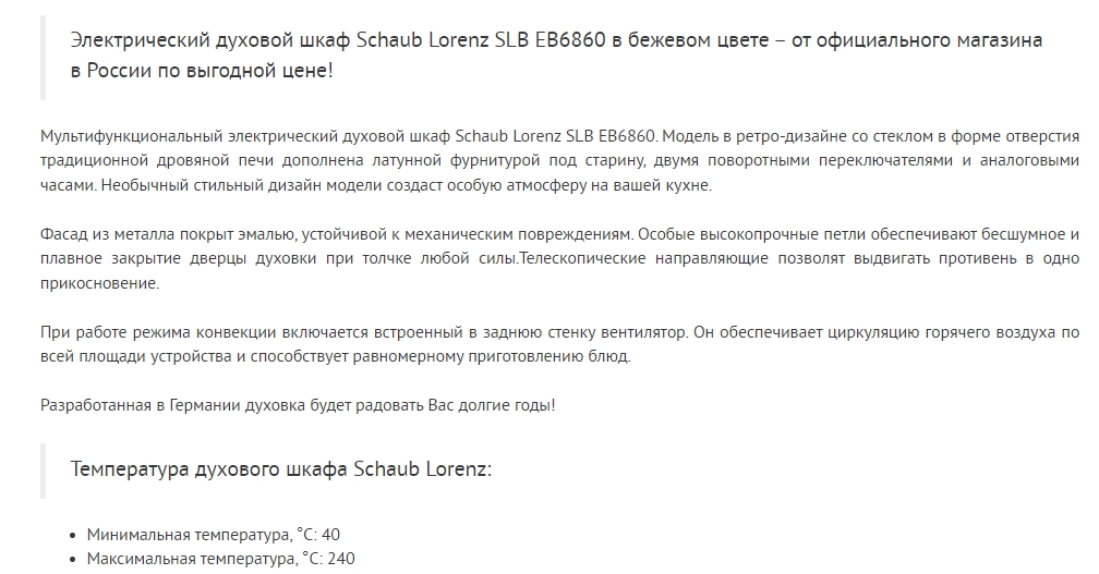 Семья и здоровое питание – основа нашей жизни. Мы хотим вдохновить Вас готовить дома и проводить больше времени в кругу семьи. Духовой шкаф Schaub Lorenz SLB EB6860 позволит воплотить в реальность все кулинарные фантазии. Если Вы еще не определились с моделью и ее необходимыми техническими характеристиками (функциями), профессиональная и честная консультация наших специалистов поможет не растеряться и сделать правильный выбор, подобрав то, что нужно именно Вам! Готовьте дома! Готовьте вместе! Готовьте вкусно с Schaub Lorenz SLB EB6860! | |