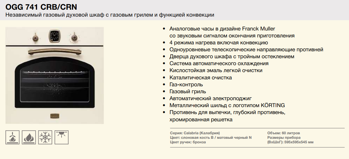 Каталитическая самоочистка Поверхность задней стенки покрыта специальным каталитическим веществом, самостоятельно расщепляющим загрязнения, которые оседают на поверхности в процессе приготовления. Для очистки необходимо прогреть камеру до максимальной температуры, после чего все жировые загрязнения растворяются. Каталитическая панель поможет значительно меньше тратить время на очистку, а значит получать удовольствие от частого приготовления. Стеклянный противень SCHOTT® Стеклянный противень от немецкой компании SCHOTT® можно расположить на столе в качестве блюда для сервировки, не перекладывая приготовленную пищу в другие емкости. К тому же гладкая структура не позволяет продуктам сильно прилипать к поверхности, что облегчает процесс очистки после приготовления. Газовый гриль Газовая горелка расположена в верхней части камеры и используется в финальной части приготовления для придания блюду румяного вида. Высокая температура горелки позволяет использовать ее в течение не более 15 минут, что вполне достаточно, чтобы блюдо приобрело красивую поджаристую корочку, при этом оставаясь нежным и сочным внутри. Телескопические направляющие Телескопические направляющие надежно удерживают противень на одном из нескольких уровней, что дает еще больше безопасности и комфорта – противень не нужно удерживать в руках, чтобы проверить качество приготовления блюд. Наличие направляющих в газовых духовых шкафах - еще один большой плюс техники Korting. Тройное остекление дверцы Специальные материалы стекла обладают свойствами защитного экрана, удерживающего тепло внутри камеры, а конструкция дверцы с применением трех стекол позволяет снизить температуру фронтальной поверхности до минимума. Все это снижает потребление электроэнергии и делает приготовление полностью безопасным. Классический дизайн Классический дизайн - это цвета, поворотные регуляторы, выполненные под бронзу, ручка дверцы и другие элементы духового шкафа, задача которых создать идеальное сочетание с натуральными материалами и фурнитурой кухонной мебели в классическом или ретро стиле. Часы в ретро стиле Внешний вид часов, расположенных на панели управления выполнен в классическом, традиционном стиле. Хотя каждый элемент часов от стрелок до цифр выглядит как и много лет назад, но внутри скрывается функциональность современного электронного таймера, который подаст акустический сигнал по истечению заданного времени. Электронный таймер Электронный таймер позволяет устанавливать акустический сигнал, который подается по истечению заданного времени даже, если духовой шкаф не находится в режиме приготовления. Таймер напомнит своим сигналом о том, что пришло время готовить блюдо или добавить дополнительные ингредиенты в процессе приготовления. Конвекция Уникальное сочетание технологий позволили использовать конвекционный вентилятор в газовых духовых шкафах. Конвекционный вентилятор обеспечивает постоянную циркуляцию горячего воздуха, нагреваемого газовой горелкой, по всей камере, что позволяет равномерно запекать блюдо со всех сторон, а также экономить время на приготовление. Приготовление блюд в газовой духовке уже никогда не будет прежним! Режим разморозки Разморозка продукта должна быть максимально деликатной чтобы продукт быстро оттаял, но н