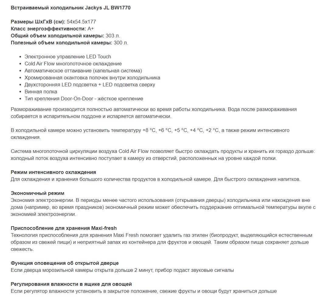 Встаиваемый холодильник Jacky's (Джекис) JL BW1770