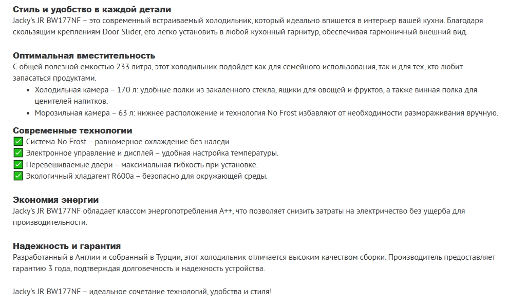 Встаиваемый холодильник Jacky's (Джекис) JR BW177NF