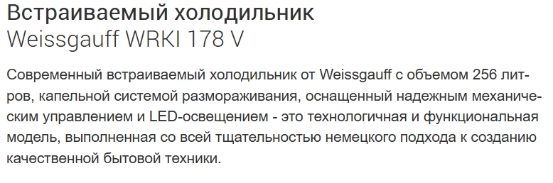 Встраиваемый холодильник Weissgauff (Вайсгауф) WRKI 178 V