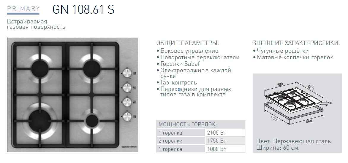 Газовая варочная панель Zigmund-Shtain (Зигмунд-Штайн) GN 108.61 S