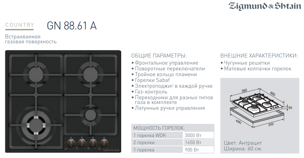 Газовая варочная панель Zigmund-Shtain (Зигмунд-Штайн) GN 88.61 A + ВИДЕО О ТОВАРЕ
