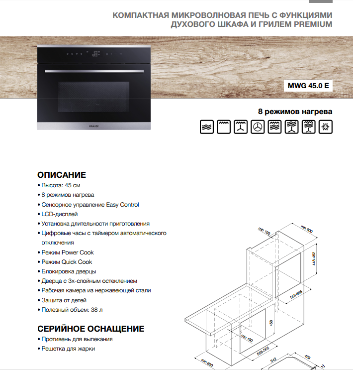 ОПИСАНИЕ - Высота: 45 см - 8 режимов нагрева: микроволны, гриль, конвекция, микроволны + гриль,
