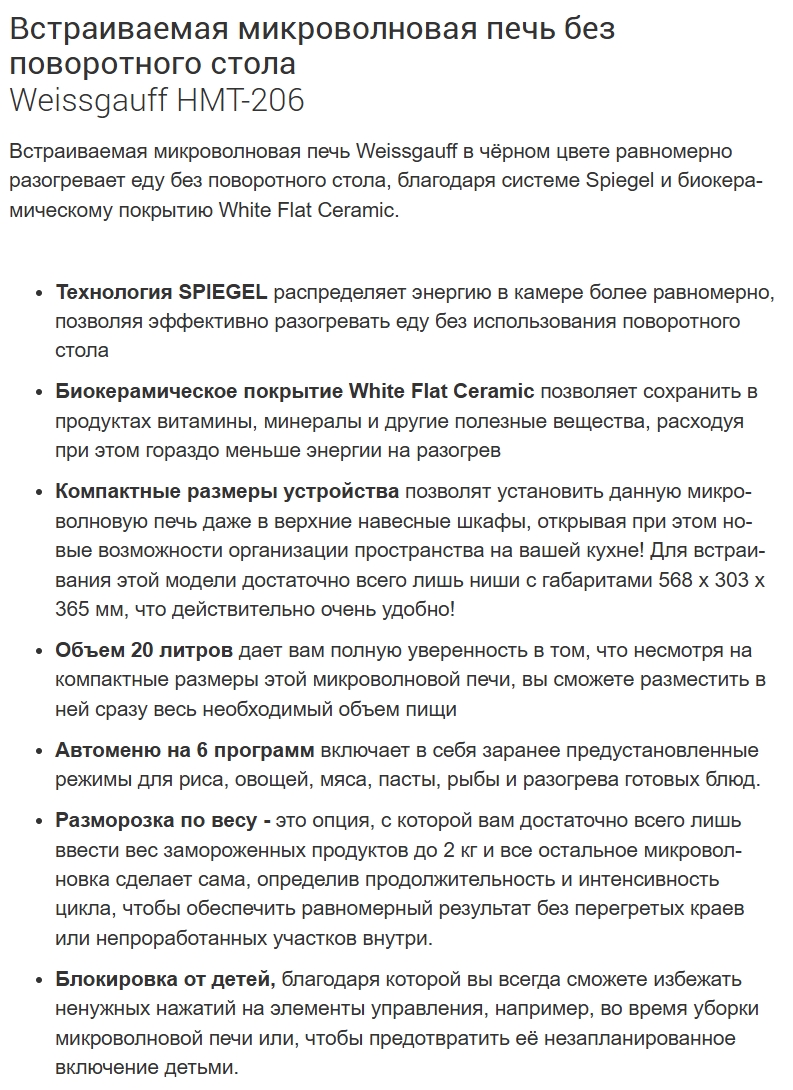 Встраиваемая микроволновая печь Weissgauff (Вайсгауф) HMT-206