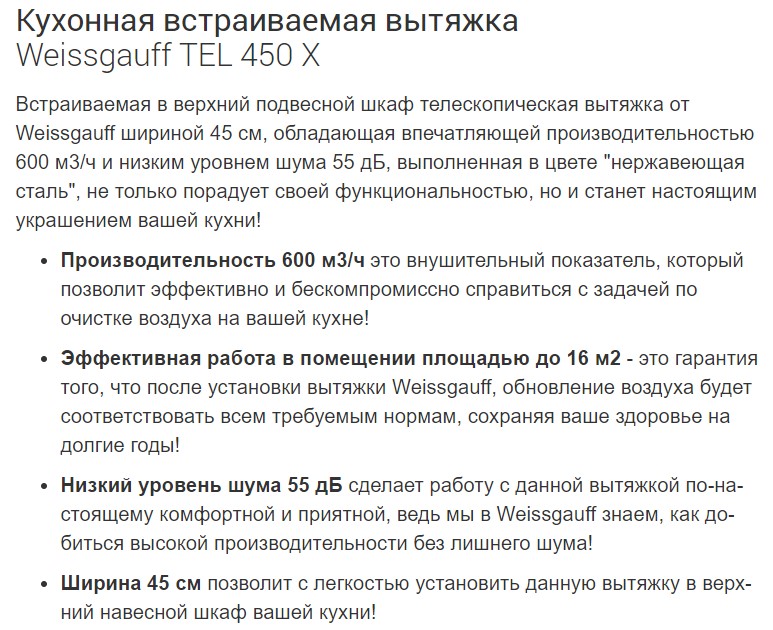 Встраиваемая вытяжка Weissgauff (Вайсгауф) TEL 450 X